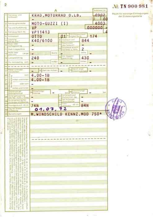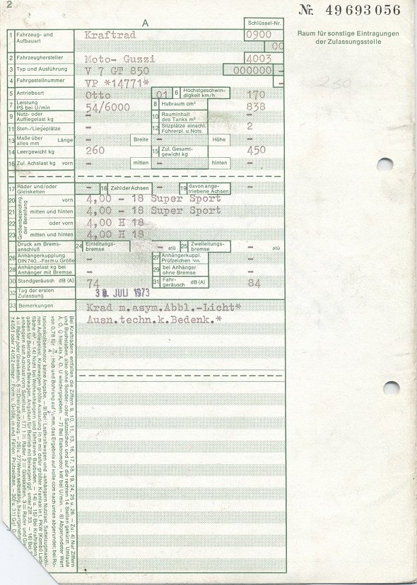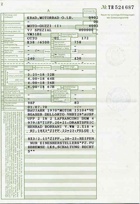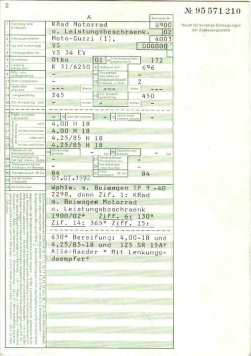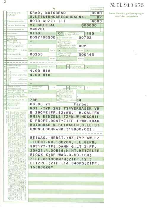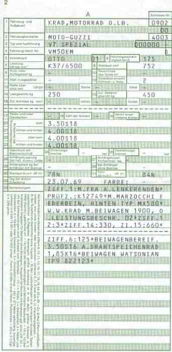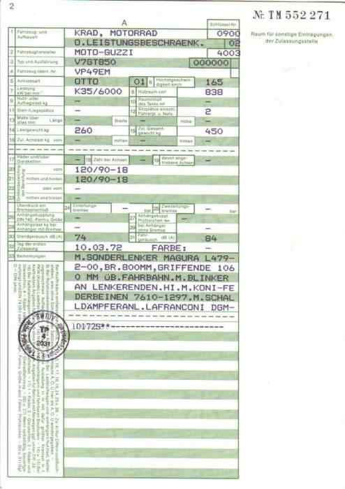 BriefkopienSo manch einer ist dankbar dafür, dem TÜV einen Präzedenzfall vorweisen zu können, wenn er eine bestimmte Reifengröße, eine Verkleidung oder Lafranconis eingetragen habe möchte. Hier nun einige Briefe mit Eintragungen, die vielleicht auch andere interessieren könnten. Manchmal ist es ja auch einfach nur amüsant, was sich da so an Eintragungen im Brief ansammelt. Brief 1: 850 GT - Lafranconi, Reifen 120 / 90-18, ... Brief 2: V7 700 - Seitenwagen (ww), Reifen 4.00 - 18, 4.25 / 85 - 18, 125 SR 15 ... Brief 3: V7 Special - Seitenwagen (ww), Marzocchi Stoßdämpfer ... Brief 4: V7 Special - MZ-Seitenwagen (ww), ... Brief 5: V7 850 California - Windschild ... Brief 6: V7 Special - Lafranconi 98 db(A)... Brief 7: V7 700 - Motor Typ VG (950 ccm), Doppelduplexbremse, Ochsenaugen Brief 8: 850 GT - Polizeiverkleidung, 30er Dell Orto ... (alter Brief ohne Eintragungen) Zulassungsbescheinigung: V7 Spezial Eintragung BT45 110/90 vorne und 120/90 hinten