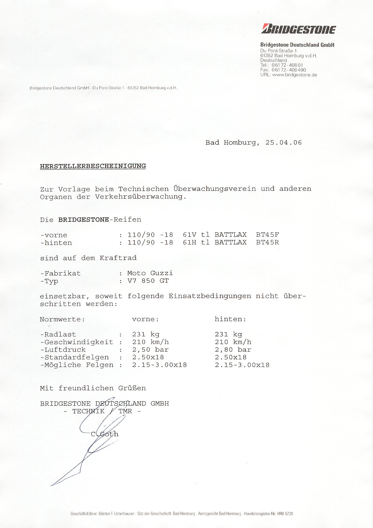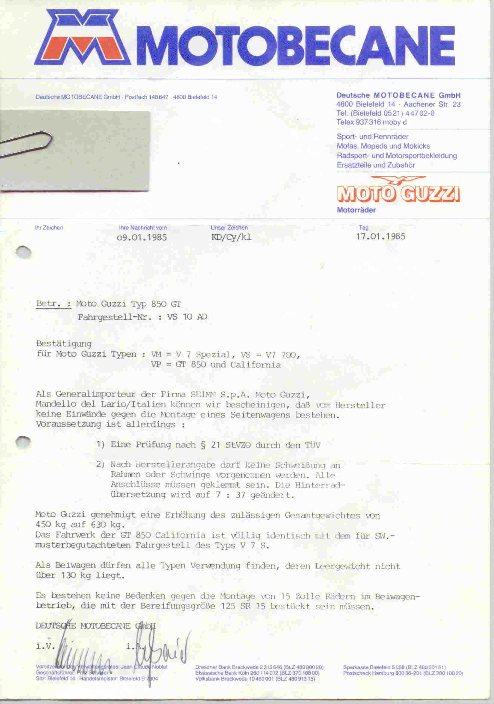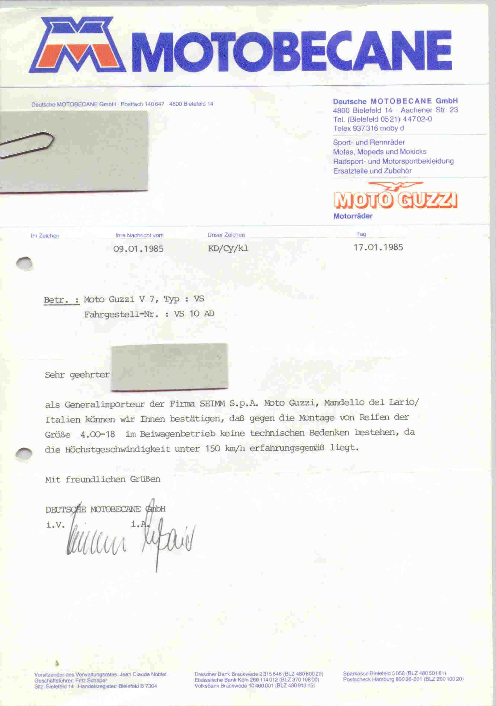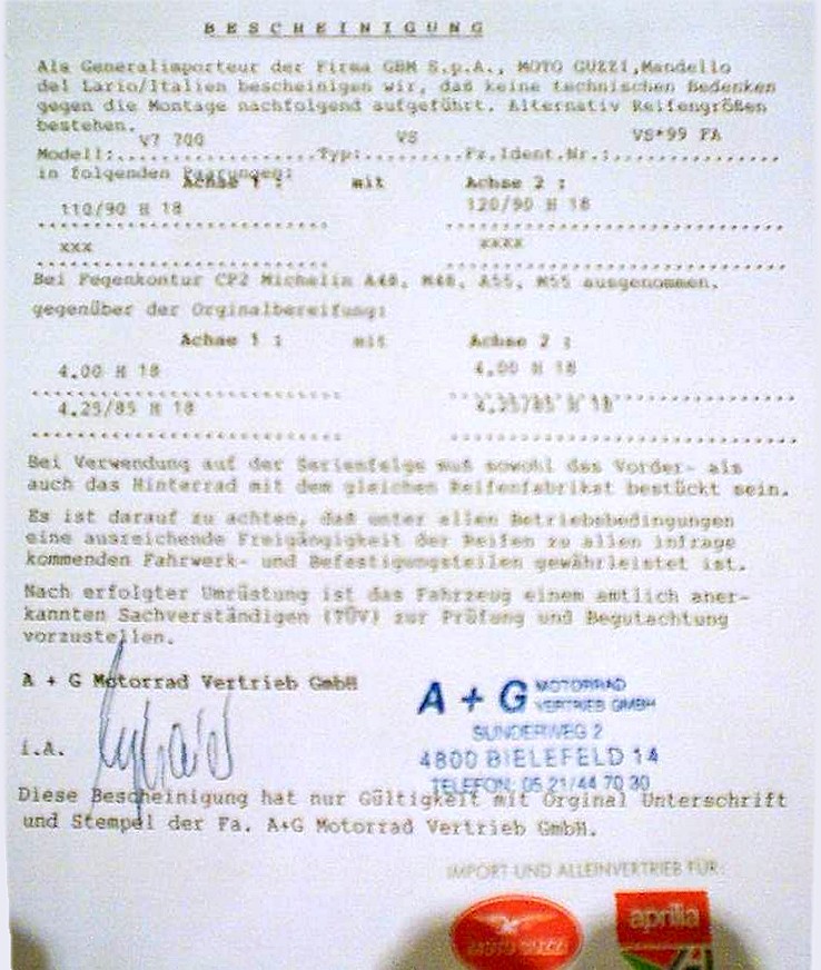 Bescheinigungen in KopieDer Wert einer schlechten Kopie gegenüber einem Original, gesiegelt und gestempelt vom Importeur oder Hersteller, wird von jeder Prüfstelle anders beurteilt. Manchem Prüfer reicht seine Erfahrung, andere wollen Papier sehen. Darum sind diese Bescheinigungen keine Garantie für Eintragungen. Sollte jemand aktuellere Freigaben oder bessere Kopien haben - nur her damit. Bescheinigung 1: Freigabe für Reifen 110/90 H 18 vorne und 120/90 H 18 hinten Bescheinigung 2: Freigabe für Gespannbetrieb für alle V7 mit Schleifenrahmen (VS, VM, VP) Bescheinigung 3: Freigabe für 4.00 - 18 ermöglicht den Block K oder runderneuerte Reifen im Gespann. Bescheinigung 4: Freigabe für BT45 110/90 vorne und 120/90 hinten Bescheinigung 5: Freigabe für BT45 110/90 vorne und hinten auf 850 GT Bescheinigung 6: Freigabe für BT45 3.50 vorne und 4.00 hinten